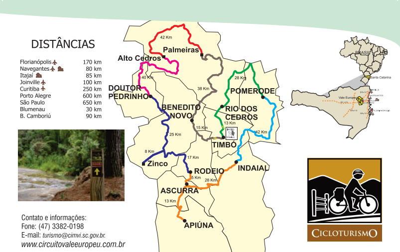 Após Pomerode, o Vale Europeu revela seu lado mais selvagem. O caminho para Indaial é marcado por estradas de terra cercadas de fazendas, riachos e silêncio quase absoluto. O narrador brinca: “passo horas sem ver uma alma, só o barulho do vento e das rodas no chão”. Para não se perder, ele recomenda usar mapas offline e seguir as setas amarelas do circuito.